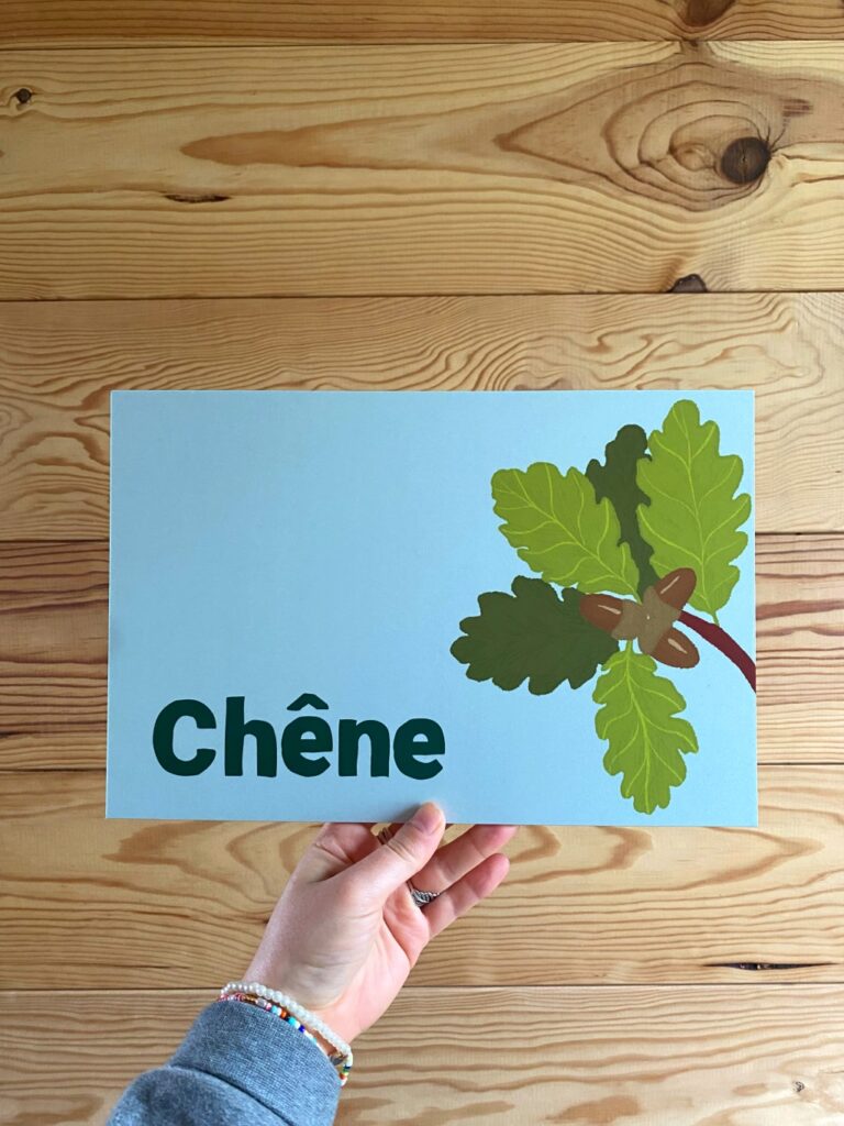 Le Gîte de Dront, situé dans le Haut-Morvan montagnard, accueille toute l'année des promeneurs. Ces panneaux ornent les portes des chambres, dont les noms réfèrent à l'environnement forestier riche qui borde la propriété .